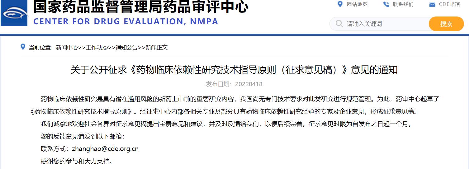 關(guān)于公開(kāi)征求《藥物臨床依賴性研究技術(shù)指導(dǎo)原則(征求意見(jiàn)稿)》意見(jiàn)的通知