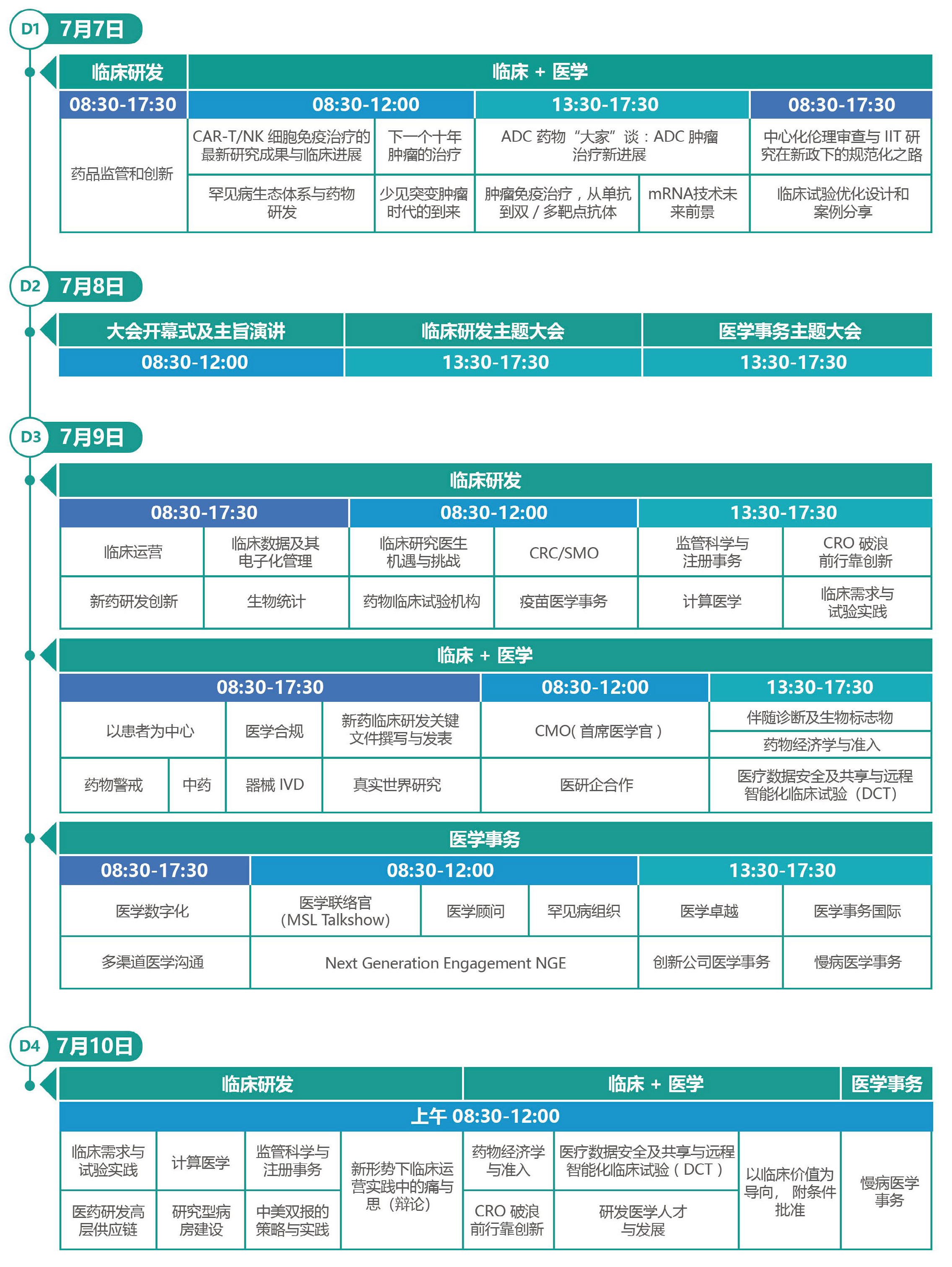 本次會議圍繞藥品監(jiān)管與創(chuàng)新、治療領域醫(yī)學熱點、臨床研發(fā)、醫(yī)學事務等模塊進行交流分享,同時設有12大專題論壇,演講專家達1000余人,緊跟行業(yè)發(fā)展趨勢,著力于解決參會同仁痛點及難點問題。