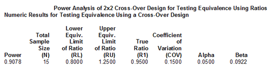 試驗設計為:交叉、兩制劑、兩周期;假設檢驗的顯著性水平(Alpha)設置為 0.05,試驗設計的把握度(Power)為 0.8,T/R 比值設定為 0.95,等效界值設定為 80.00%-125.00%,分別以個體內(nèi)變異為 15% 和 30% 為例,進行計算,結果如下: