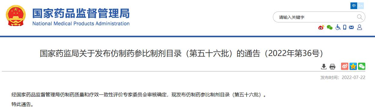 國家藥監(jiān)局關于發(fā)布仿制藥參比制劑目錄(第五十六批)的通告(2022年第36號)