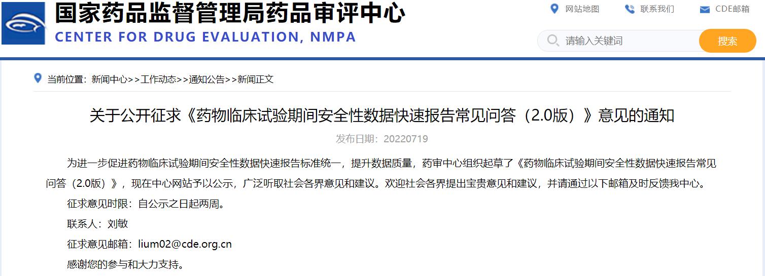 關于公開征求《藥物臨床試驗期間安全性數(shù)據(jù)快速報告常見問答(2.0版)》意見的通知