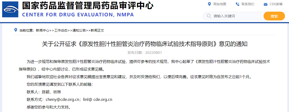 關(guān)于公開征求《原發(fā)性膽汁性膽管炎治療藥物臨床試驗技術(shù)指導(dǎo)原則》意見的通知