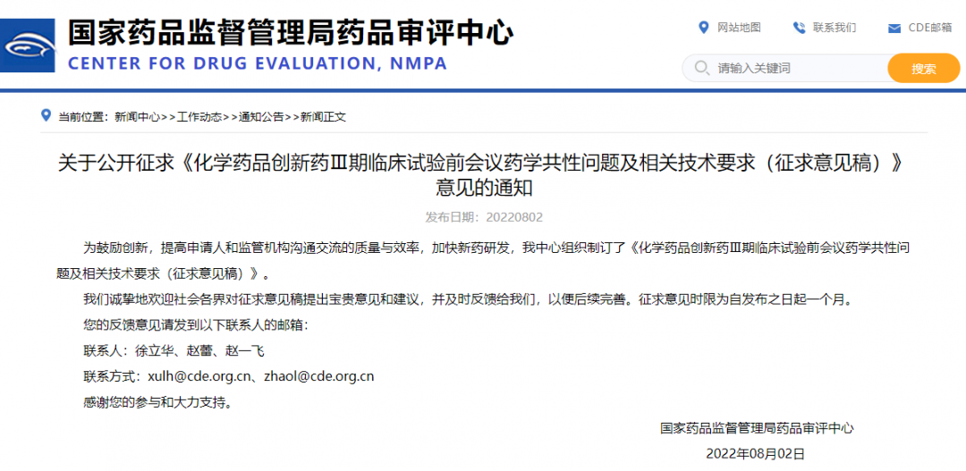 關(guān)于公開征求《化學(xué)藥品創(chuàng)新藥Ⅲ期臨床試驗前會議藥學(xué)共性問題及相關(guān)技術(shù)要求(征求意見稿)》意見的通知