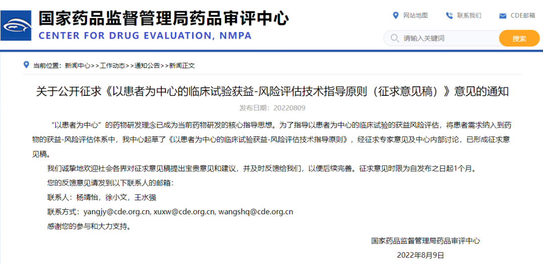 關(guān)于公開征求《以患者為中心的臨床試驗獲益-風(fēng)險評估技術(shù)指導(dǎo)原則(征求意見稿)》意見的通知