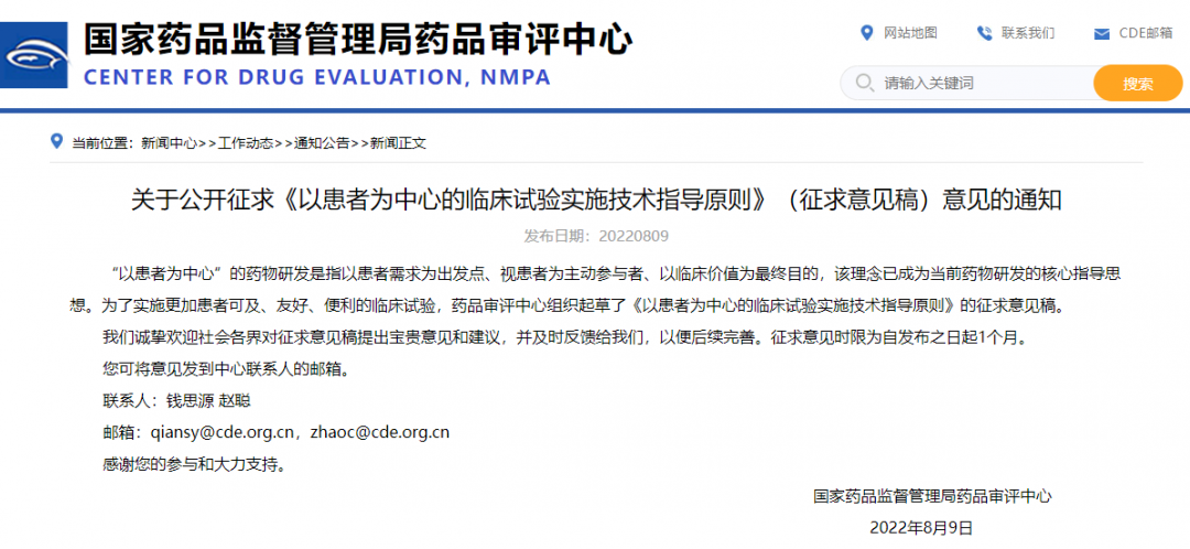 關(guān)于公開征求《以患者為中心的臨床試驗實施技術(shù)指導(dǎo)原則》(征求意見稿)意見的通知
