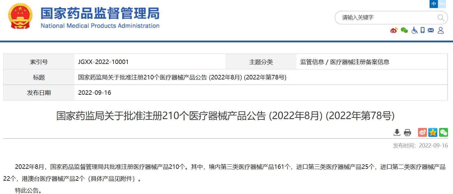 國(guó)家藥監(jiān)局關(guān)于批準(zhǔn)注冊(cè)210個(gè)醫(yī)療器械產(chǎn)品公告 (2022年8月) (2022年第78號(hào))
