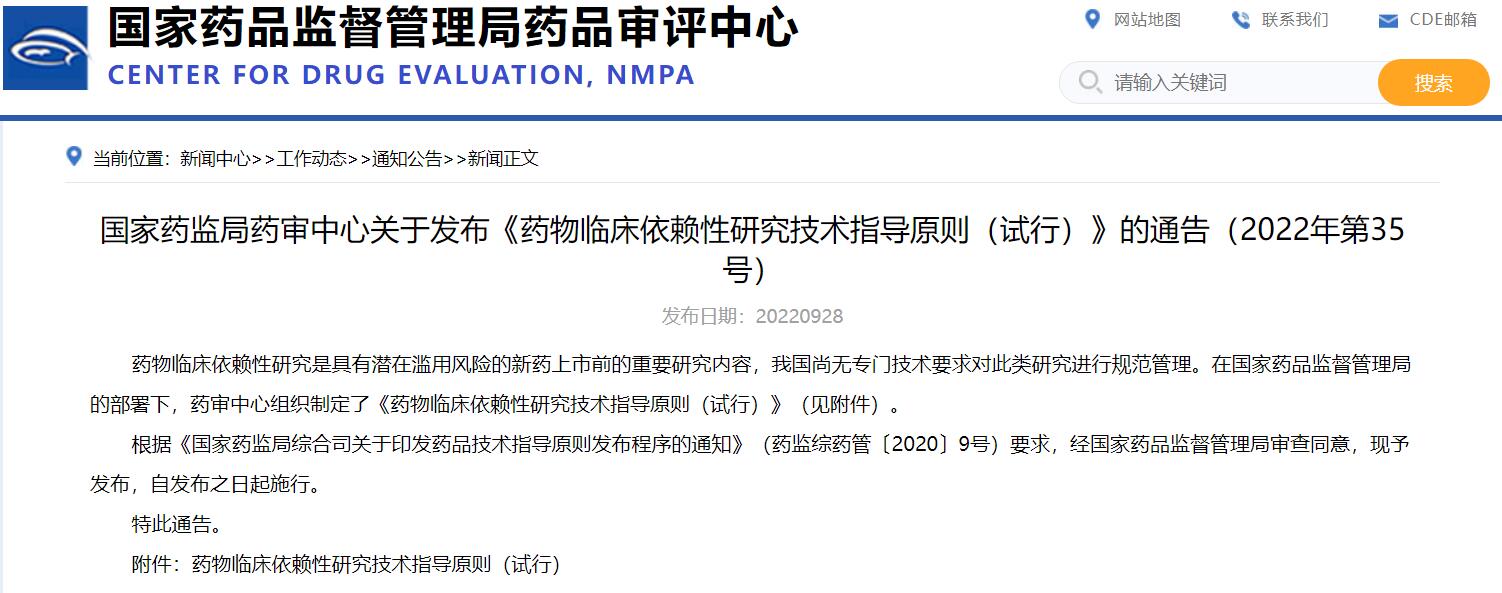 國家藥監(jiān)局藥審中心關(guān)于發(fā)布《藥物臨床依賴性研究技術(shù)指導(dǎo)原則(試行)》的通告(2022年第35號)