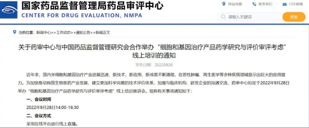 關(guān)于藥審中心與中國藥品監(jiān)督管理研究會合作舉辦“細(xì)胞和基因治療產(chǎn)品藥學(xué)研究與評價審評考慮”線上培訓(xùn)的通知