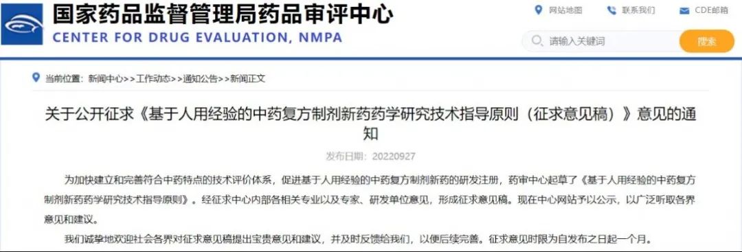 關(guān)于公開征求《基于人用經(jīng)驗的中藥復(fù)方制劑新藥藥學(xué)研究技術(shù)指導(dǎo)原則(征求意見稿)》意見的通知