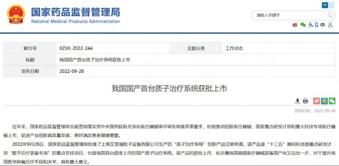 我國國產(chǎn)首臺質(zhì)子治療系統(tǒng)獲批上市