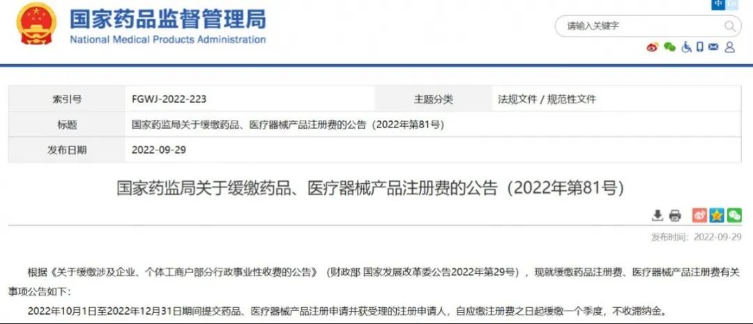 .國家藥監(jiān)局關(guān)于緩繳藥品、醫(yī)療器械產(chǎn)品注冊費的公告(2022年第81號)