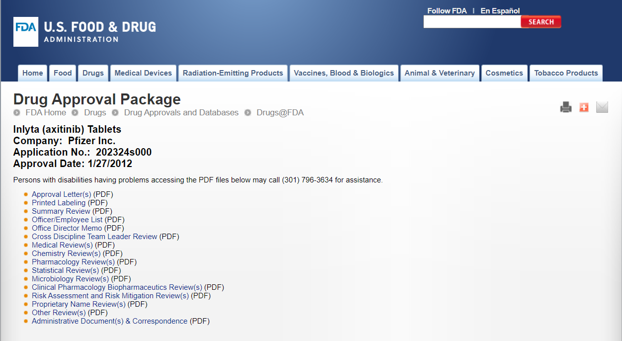 - 首先進入Drugs@FDA的搜索欄輸入阿昔替尼片的活性成分“axitinib”,然后點擊提