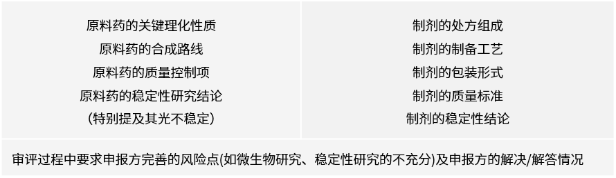 化學審查報告是對該藥物原料藥與制劑合成/生產(chǎn)工藝、理化性質(zhì)研究、質(zhì)量控制體系研究、穩(wěn)定性研究等方面的審查結(jié)論。在阿昔替尼片劑的化學審評報告(Chemistry Review)中,審評員總結(jié)概括的內(nèi)容涉及以下方面: