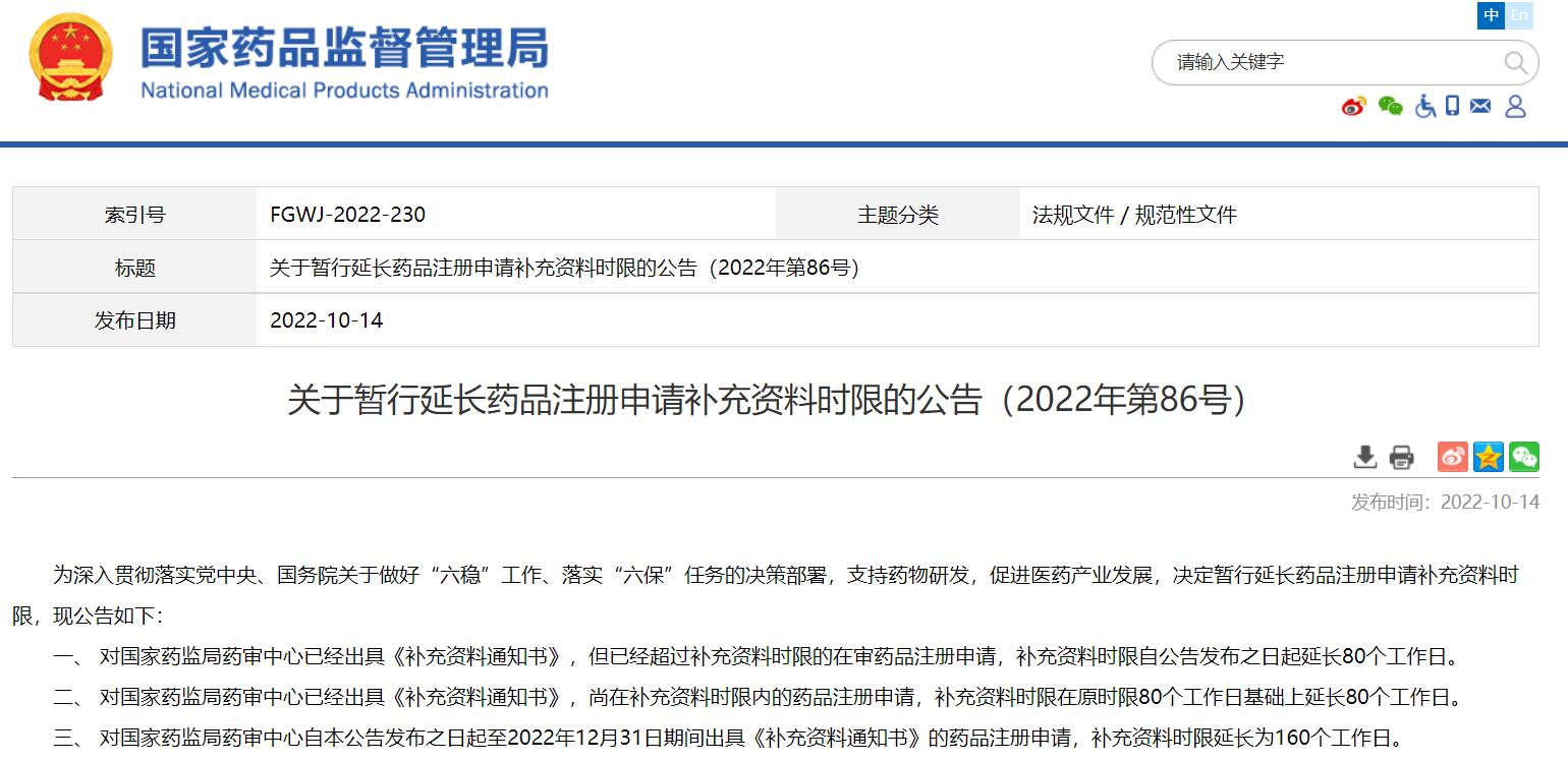關(guān)于暫行延長(zhǎng)藥品注冊(cè)申請(qǐng)補(bǔ)充資料時(shí)限的公告(2022年第86號(hào))
