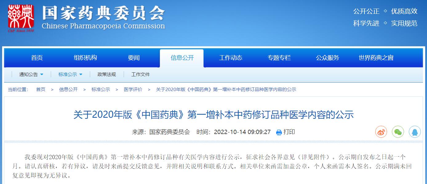 關(guān)于2020年版《中國(guó)藥典》第一增補(bǔ)本中藥修訂品種醫(yī)學(xué)內(nèi)容的公示