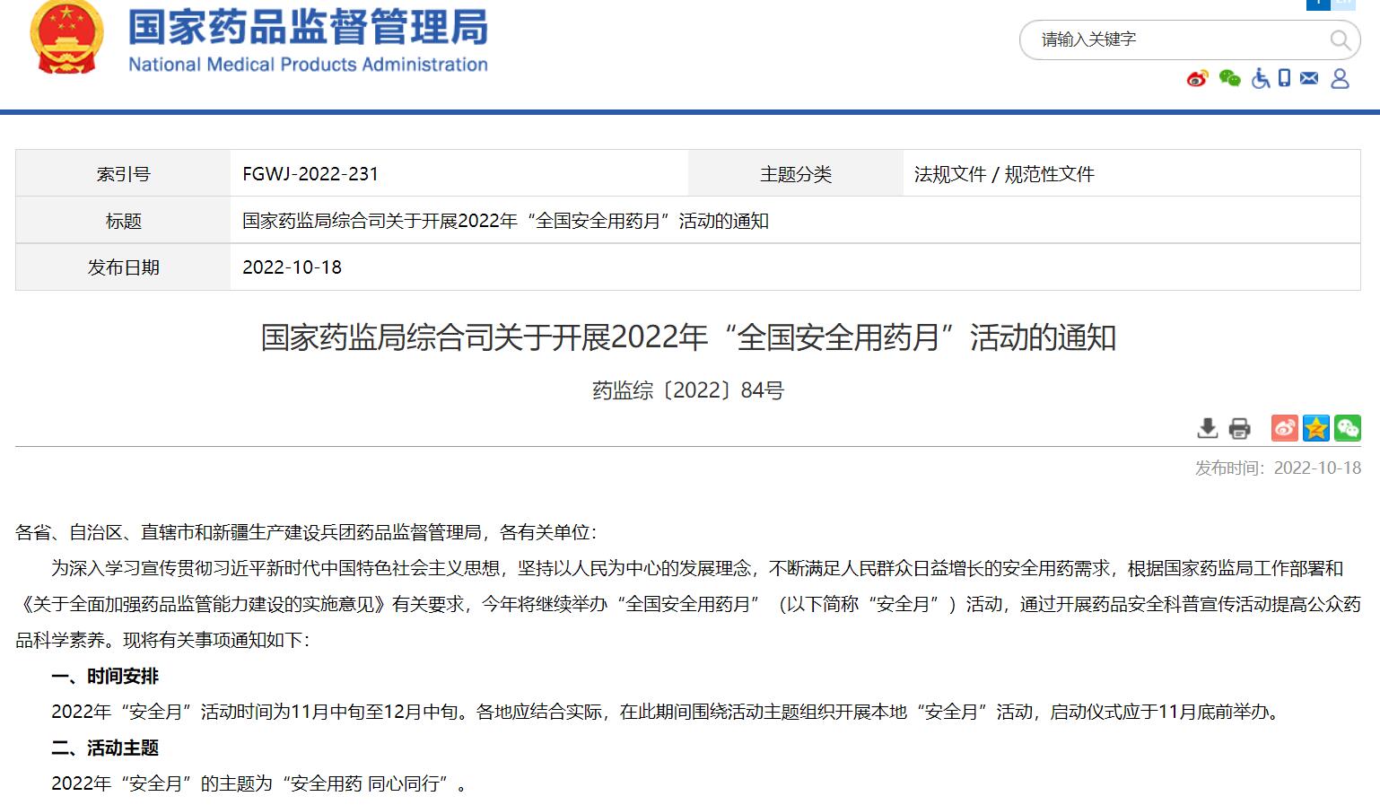 國(guó)家藥監(jiān)局綜合司關(guān)于開(kāi)展2022年“全國(guó)安全用藥月”活動(dòng)的通知