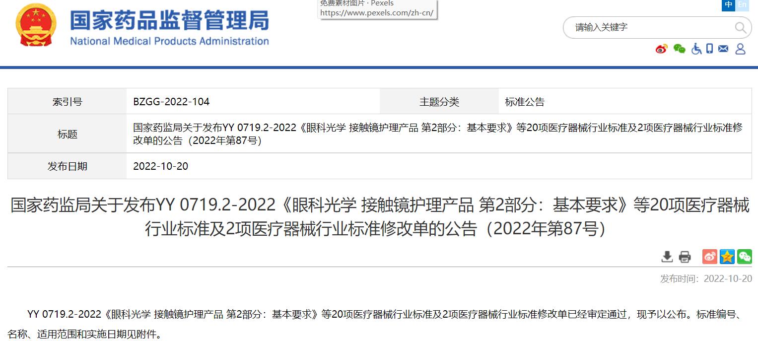 國(guó)家藥監(jiān)局關(guān)于發(fā)布YY 0719.2-2022《眼科光學(xué)接觸鏡護(hù)理產(chǎn)品第2部分:基本要求》等20項(xiàng)醫(yī)療器械行業(yè)標(biāo)準(zhǔn)及2項(xiàng)醫(yī)療器械行業(yè)標(biāo)準(zhǔn)修改單的公告(2022年第87號(hào))