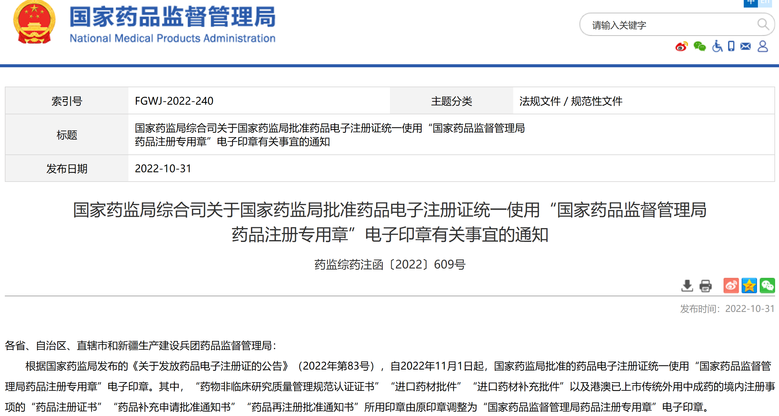 國(guó)家藥監(jiān)局綜合司關(guān)于國(guó)家藥監(jiān)局批準(zhǔn)藥品電子注冊(cè)證統(tǒng)一使用“國(guó)家藥品監(jiān)督管理局藥品注冊(cè)專用章”電子印章有關(guān)事宜的通知
