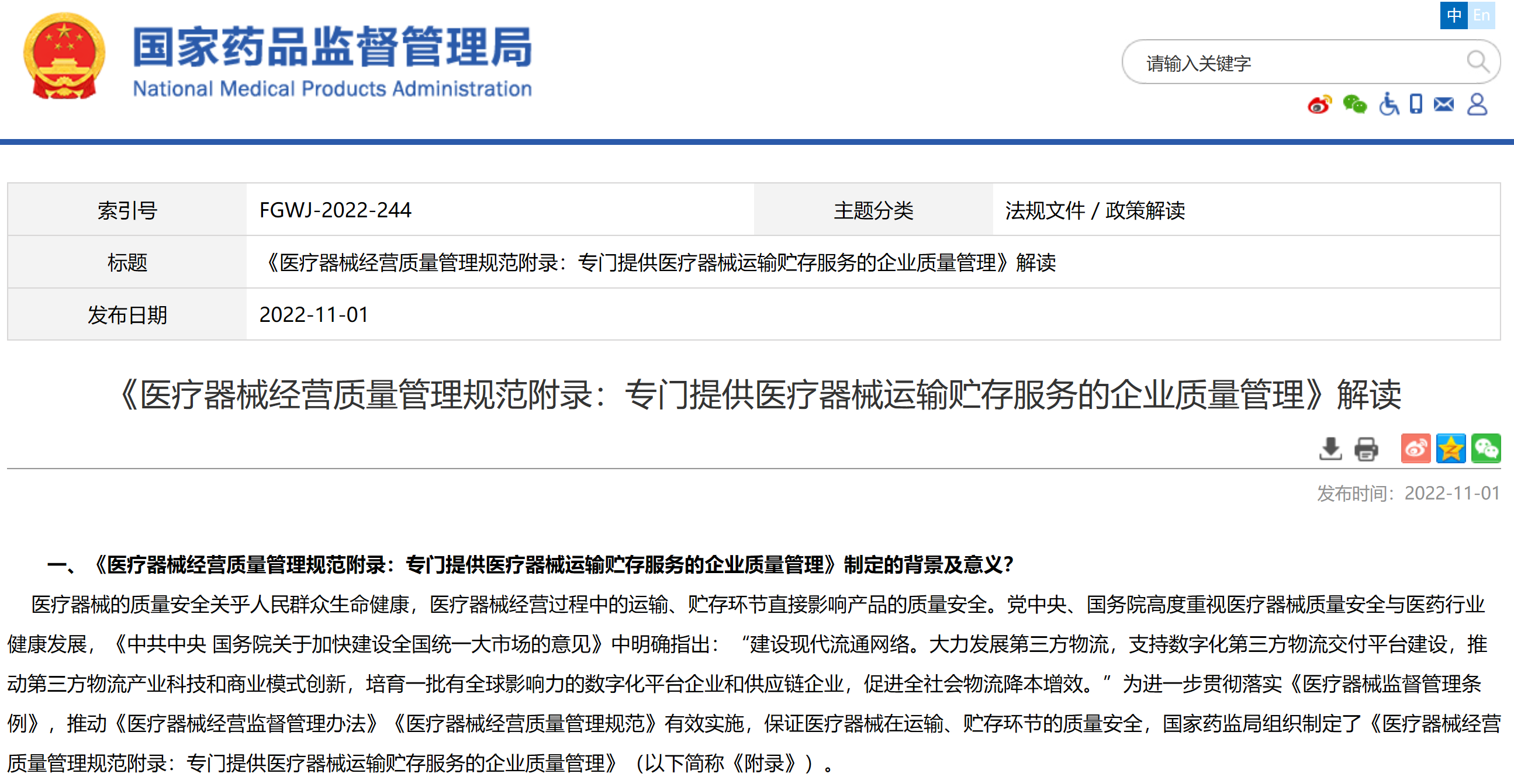 國(guó)家藥監(jiān)局關(guān)于發(fā)布《醫(yī)療器械經(jīng)營(yíng)質(zhì)量管理規(guī)范附錄:專門提供醫(yī)療器械運(yùn)輸貯存服務(wù)的企業(yè)質(zhì)量管理》的公告(2022年第94號(hào))