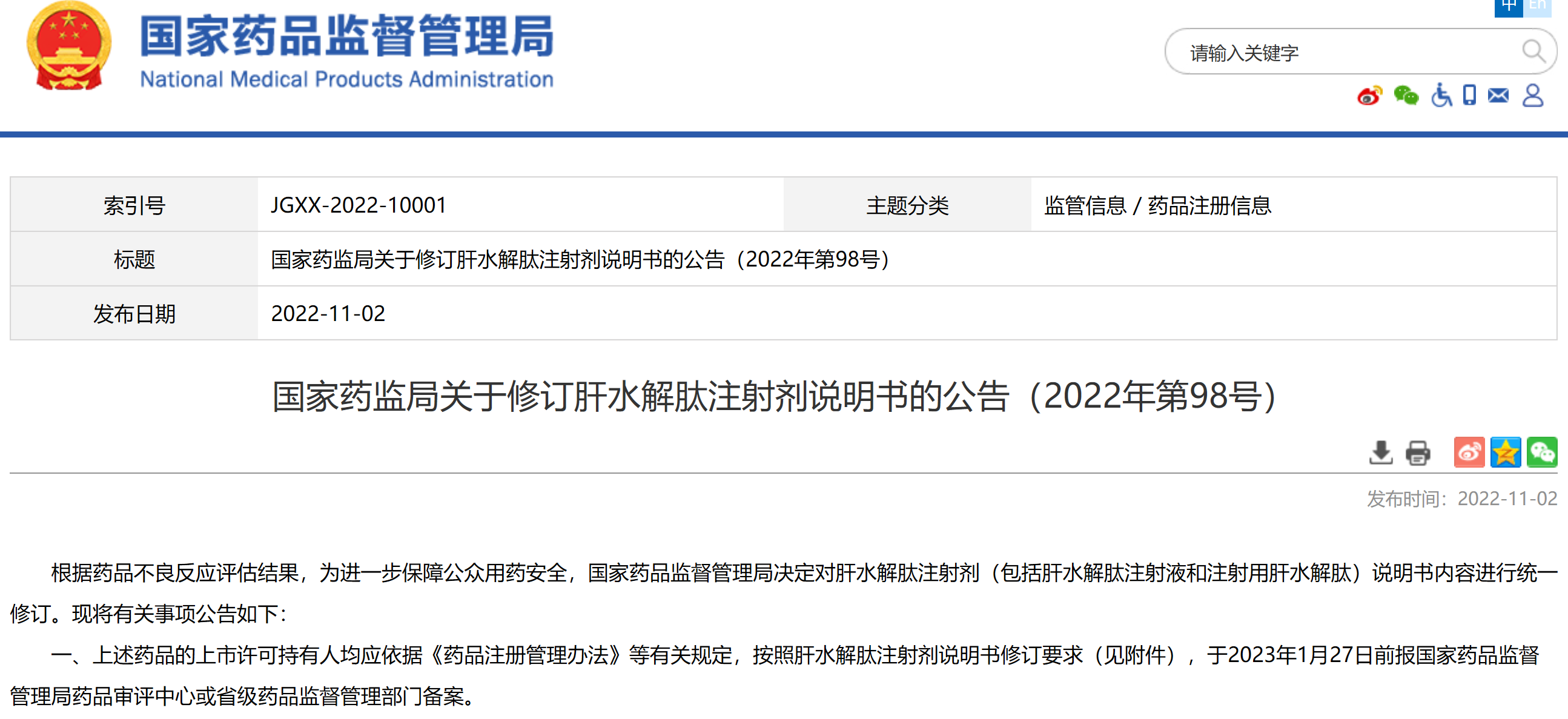 國(guó)家藥監(jiān)局關(guān)于修訂肝水解肽注射劑說明書的公告(2022年第98號(hào))