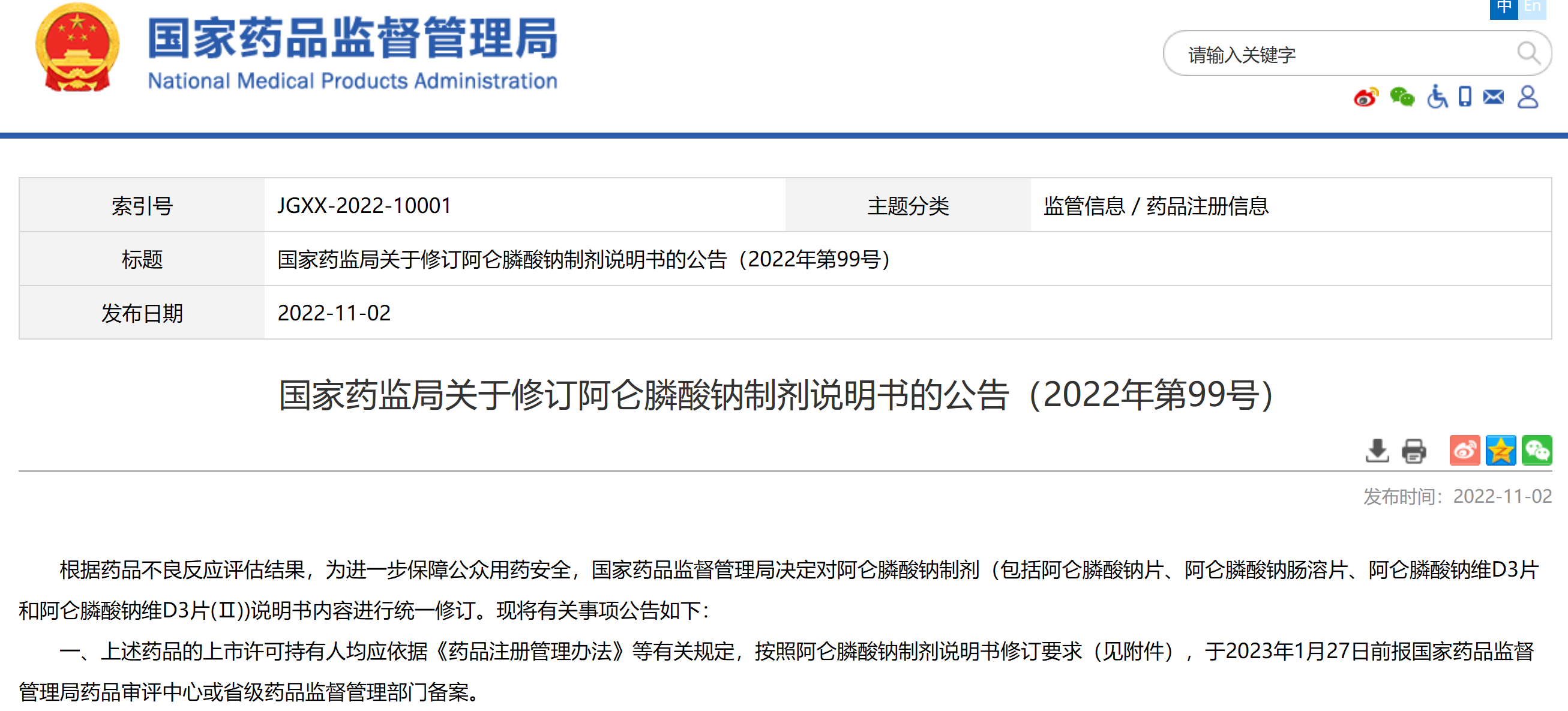 國(guó)家藥監(jiān)局關(guān)于修訂阿侖膦酸鈉制劑說明書的公告(2022年第99號(hào))