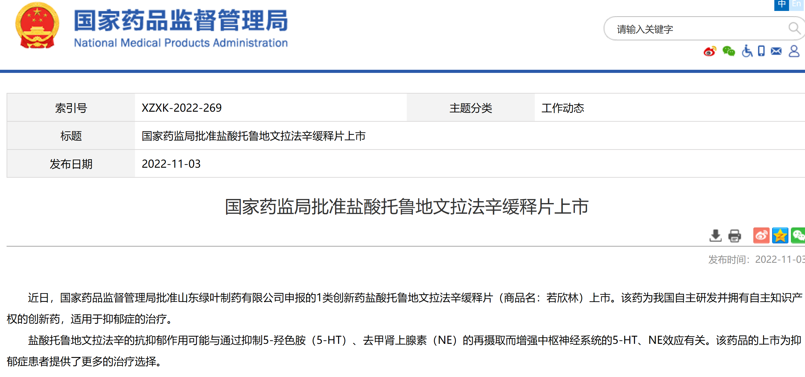 國(guó)家藥監(jiān)局批準(zhǔn)鹽酸托魯?shù)匚睦ㄐ辆忈屍鲜?/span>