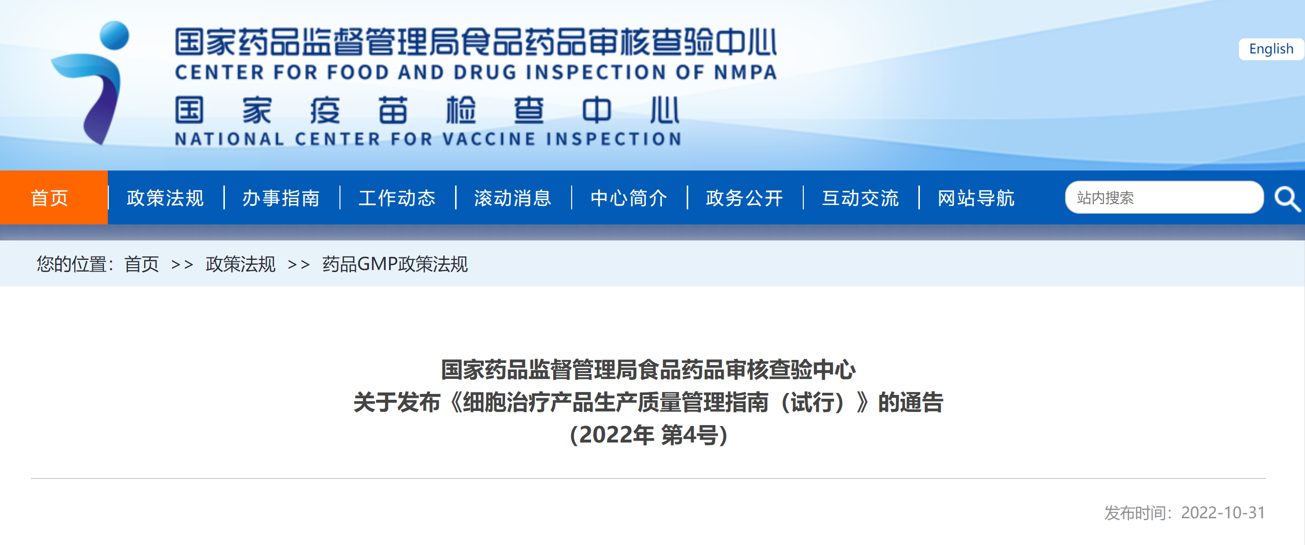 國(guó)家藥品監(jiān)督管理局食品藥品審核查驗(yàn)中心關(guān)于發(fā)布《細(xì)胞治療產(chǎn)品生產(chǎn)質(zhì)量管理指南(試行)》的通告(2022年第4號(hào))