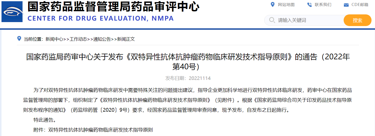 國家藥監(jiān)局藥審中心關(guān)于發(fā)布《雙特異性抗體抗腫瘤藥物臨床研發(fā)技術(shù)指導原則》的通告(2022年第40號)