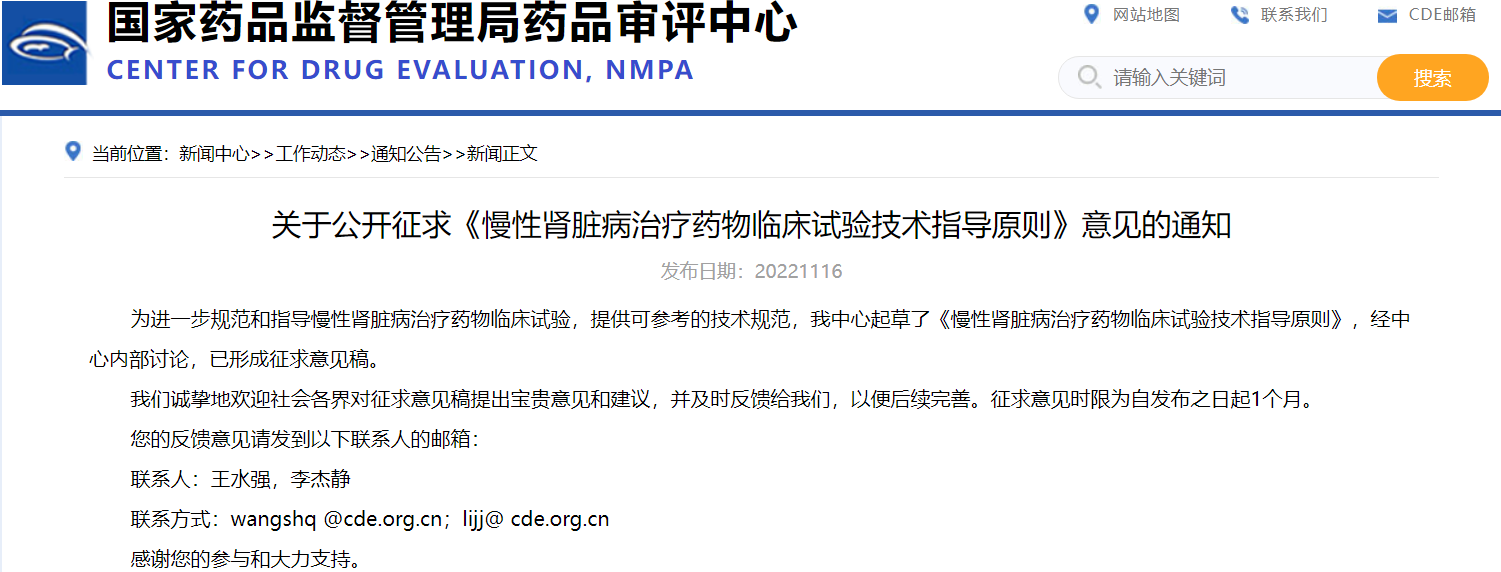 關(guān)于公開征求《慢性腎臟病治療藥物臨床試驗技術(shù)指導原則》意見的通知