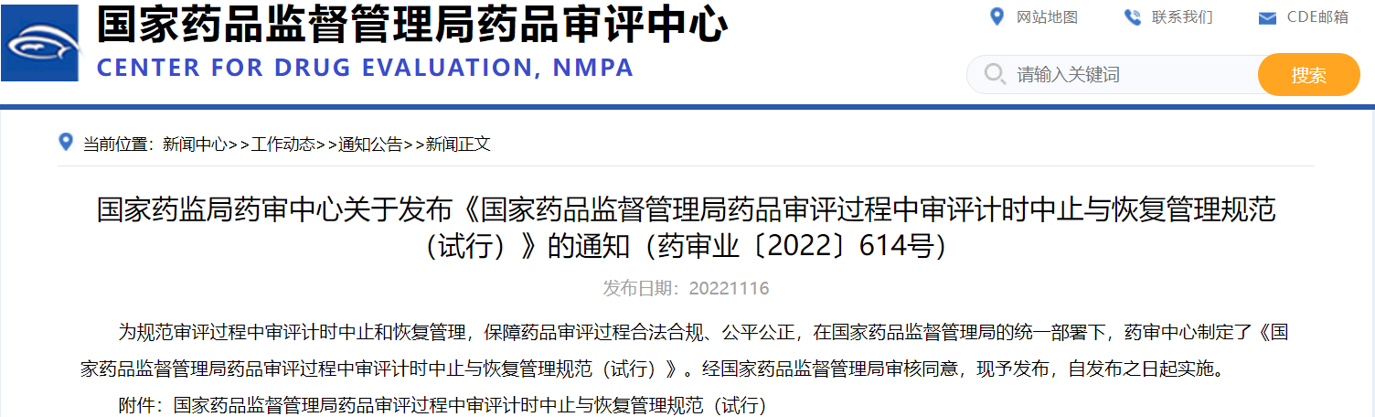 國家藥監(jiān)局藥審中心關(guān)于發(fā)布《國家藥品監(jiān)督管理局藥品審評過程中審評計時中止與恢復管理規(guī)范(試行)》的通知(藥審業(yè)〔2022〕614號)