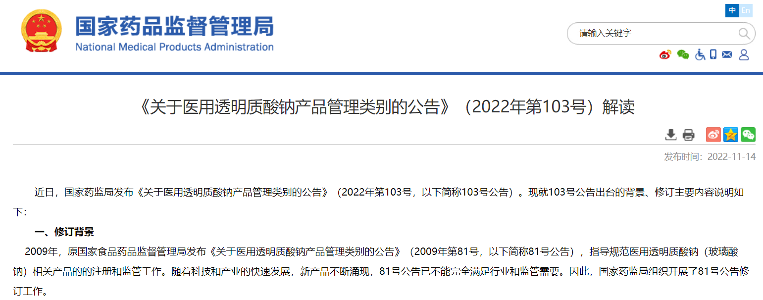 國家藥監(jiān)局關(guān)于醫(yī)用透明質(zhì)酸鈉產(chǎn)品管理類別的公告(2022年第103號)