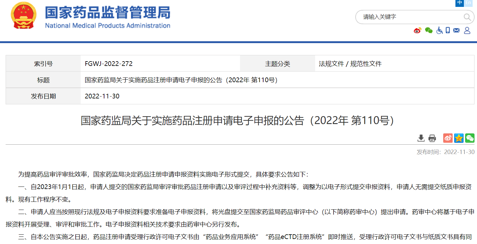 國家藥監(jiān)局關(guān)于實施藥品注冊申請電子申報的公告(2022年 第110號)