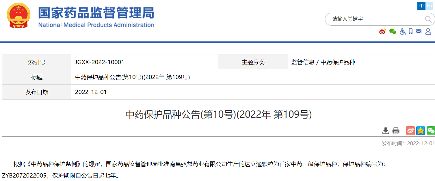 中藥保護品種公告(第10號)(2022年 第109號)