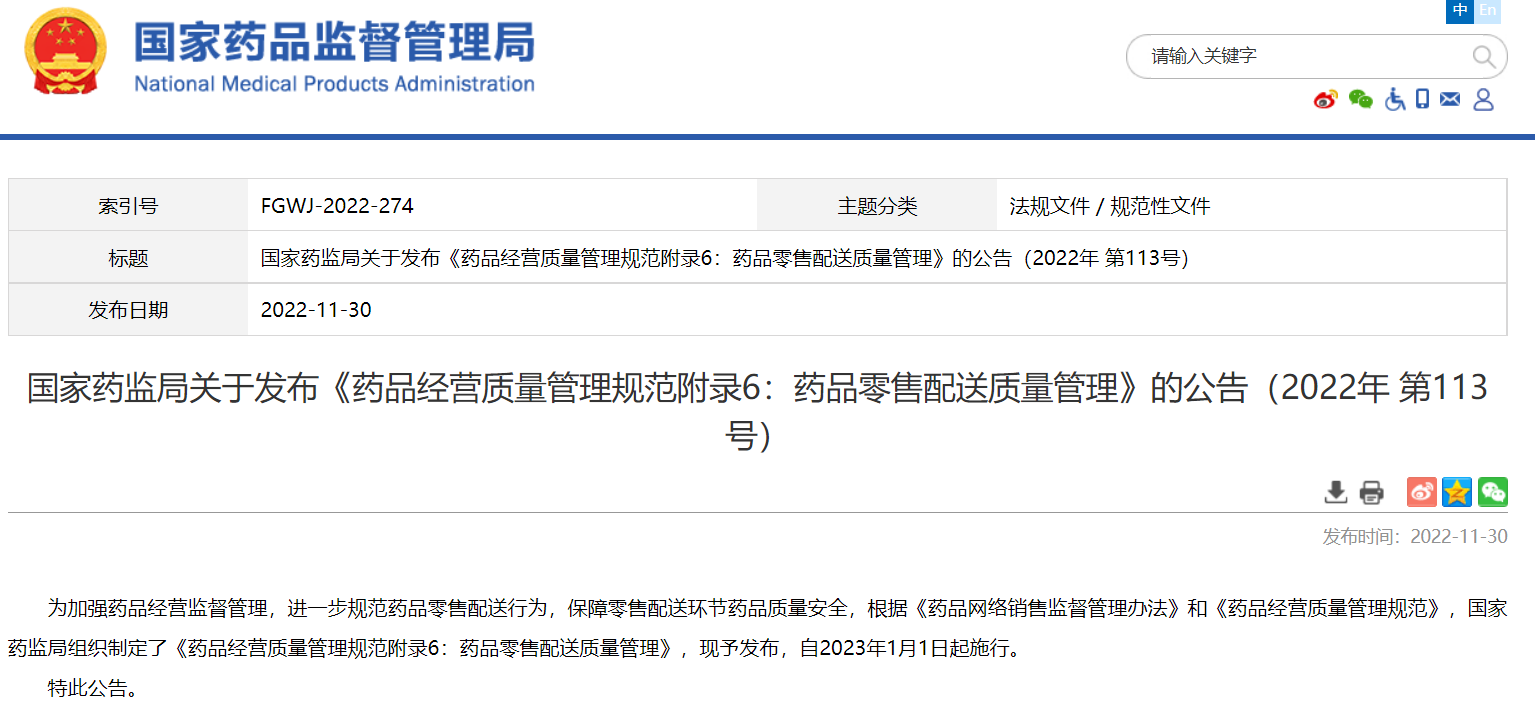國家藥監(jiān)局關(guān)于發(fā)布《藥品經(jīng)營質(zhì)量管理規(guī)范附錄6:藥品零售配送質(zhì)量管理》的公告(2022年 第113號)