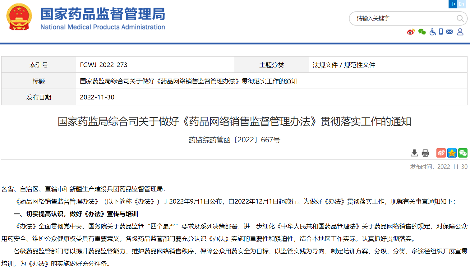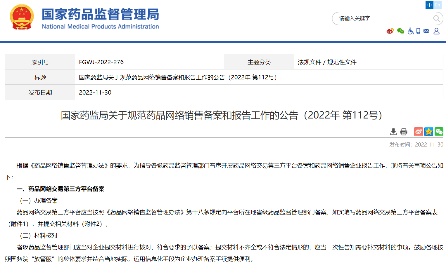 國家藥監(jiān)局關(guān)于規(guī)范藥品網(wǎng)絡(luò)銷售備案和報告工作的公告(2022年 第112號)