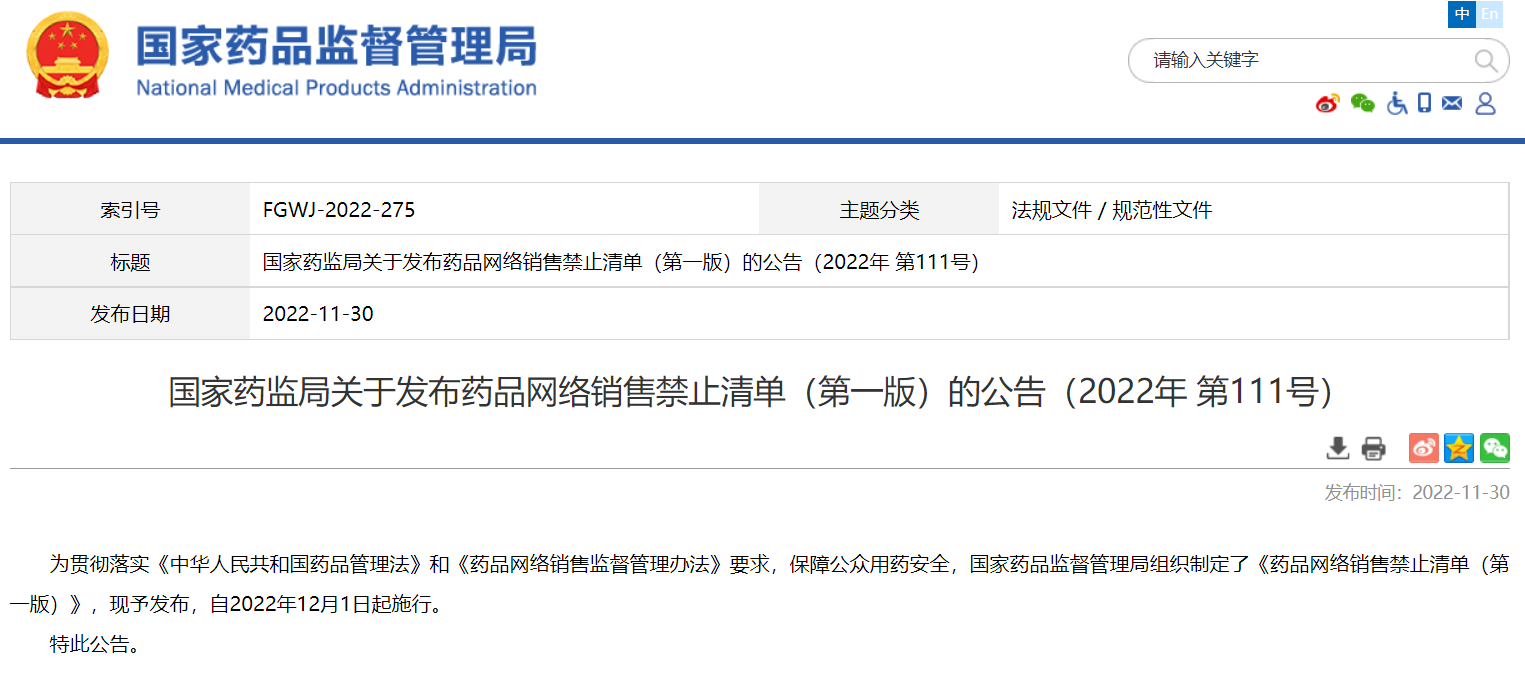 國家藥監(jiān)局關(guān)于發(fā)布藥品網(wǎng)絡(luò)銷售禁止清單(第一版)的公告(2022年 第111號)