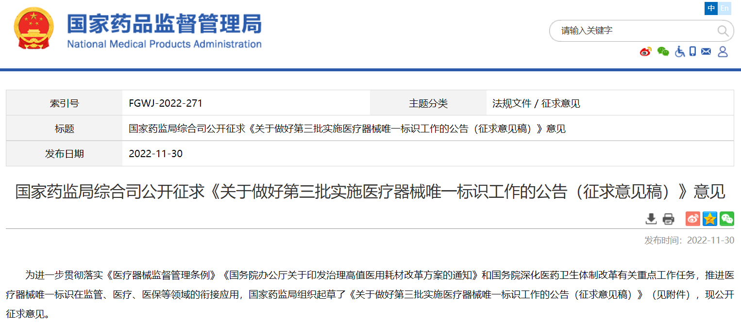 國家藥監(jiān)局綜合司公開征求《關(guān)于做好第三批實施醫(yī)療器械唯一標(biāo)識工作的公告(征求意見稿)》意見