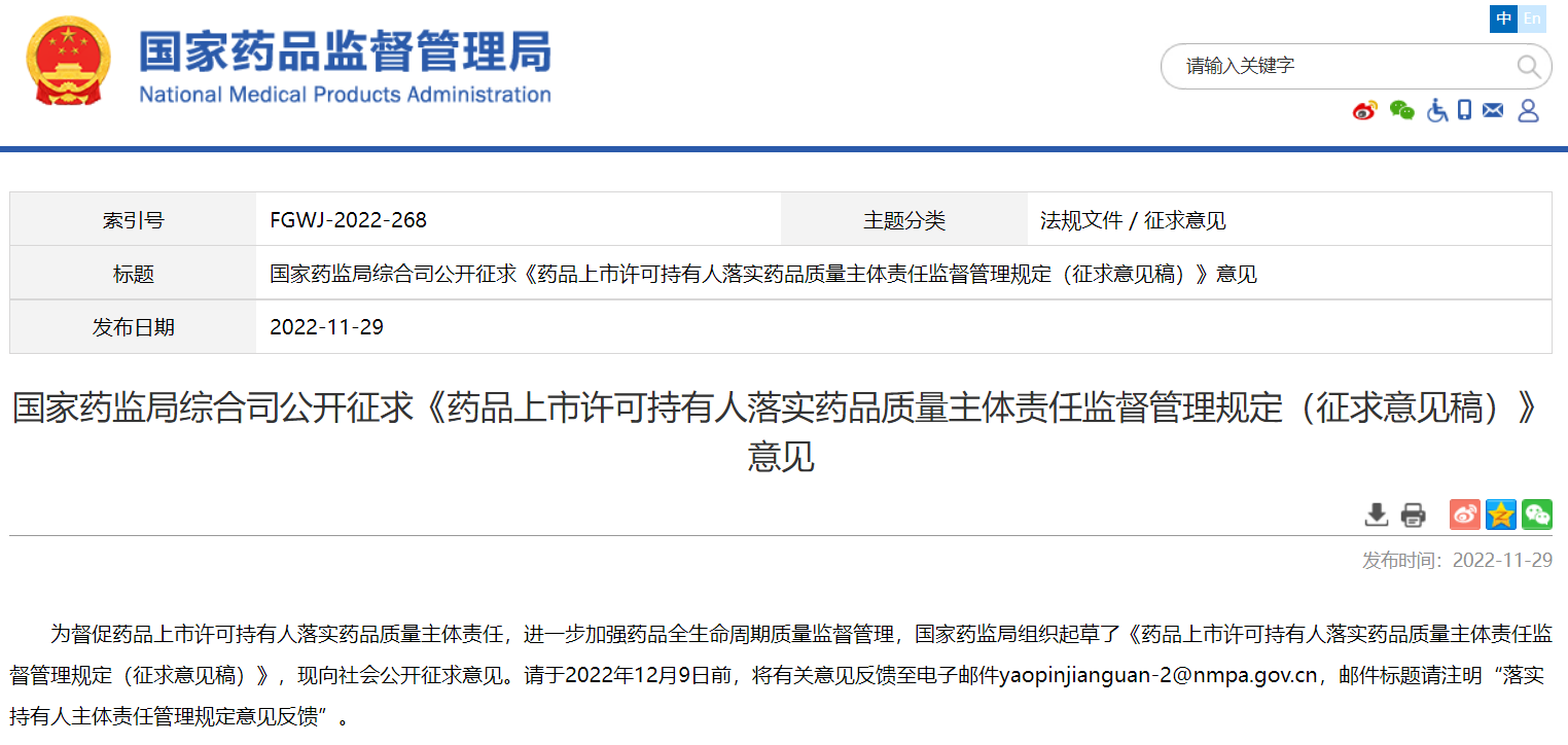 國家藥監(jiān)局綜合司公開征求《藥品上市許可持有人落實藥品質(zhì)量主體責(zé)任監(jiān)督管理規(guī)定》意見