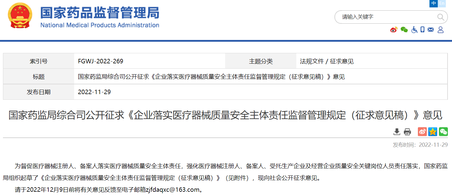 國家藥監(jiān)局綜合司公開征求《企業(yè)落實醫(yī)療器械質(zhì)量安全主體責(zé)任監(jiān)督管理規(guī)定(征求意見稿)》意見