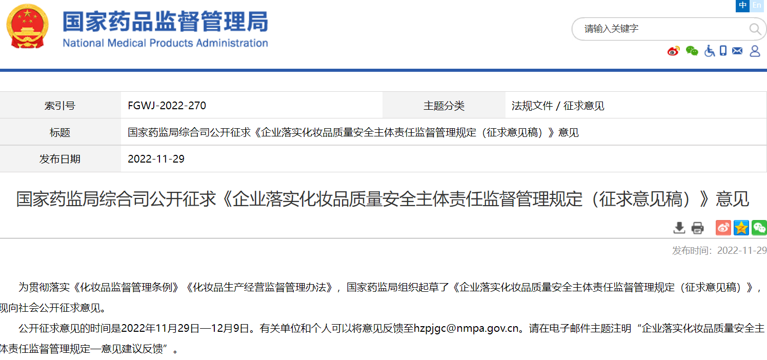 國家藥監(jiān)局綜合司公開征求《企業(yè)落實化妝品質(zhì)量安全主體責(zé)任監(jiān)督管理規(guī)定(征求意見稿)》意見