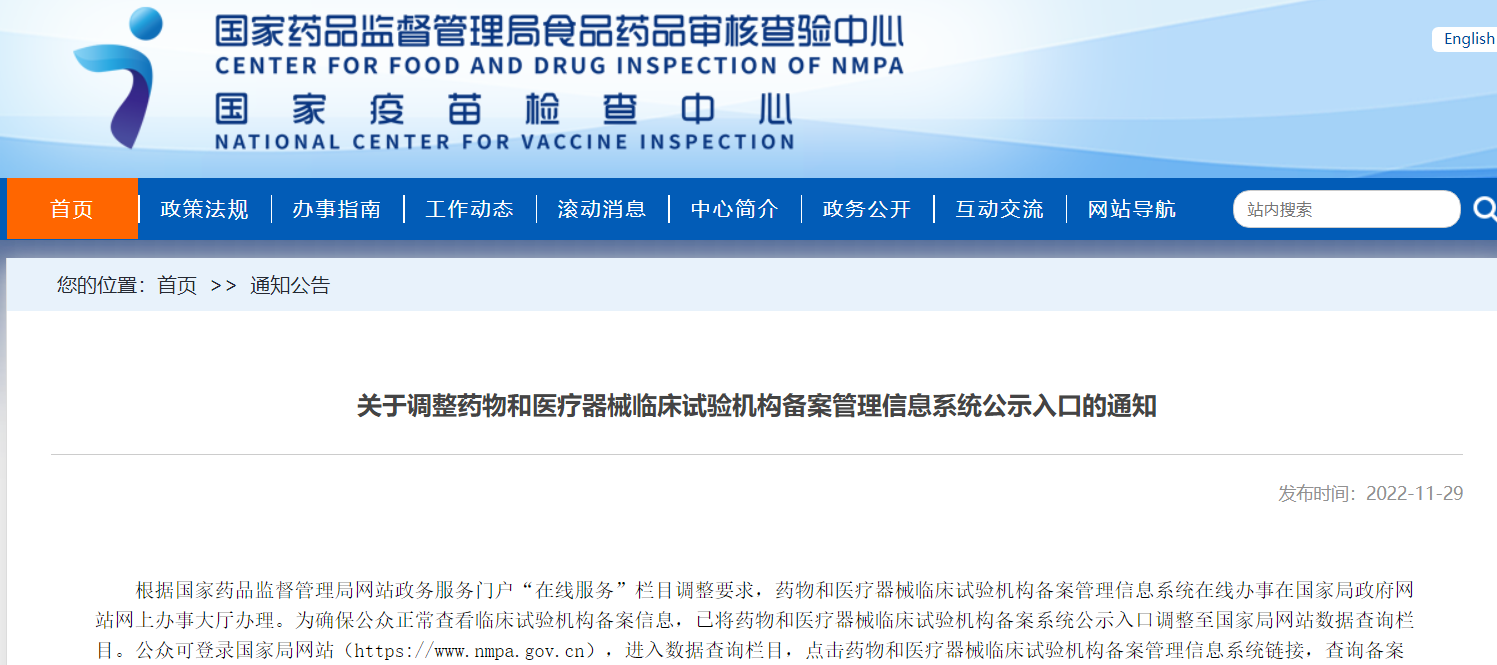 關(guān)于調(diào)整藥物和醫(yī)療器械臨床試驗機構(gòu)備案管理信息系統(tǒng)公示入口的通知