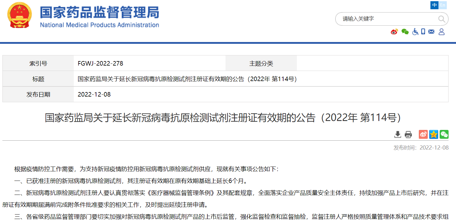 國家藥監(jiān)局關(guān)于延長新冠病毒抗原檢測試劑注冊證有效期的公告(2022年 第114號)