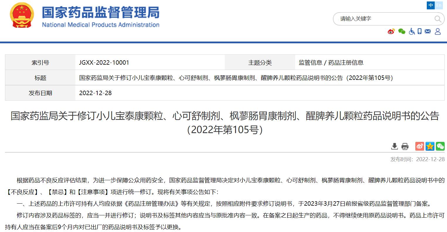 國家藥監(jiān)局關(guān)于修訂小兒寶泰康顆粒、心可舒制劑、楓蓼腸胃康制劑、醒脾養(yǎng)兒顆粒藥品說明書的公告(2022年第105號)