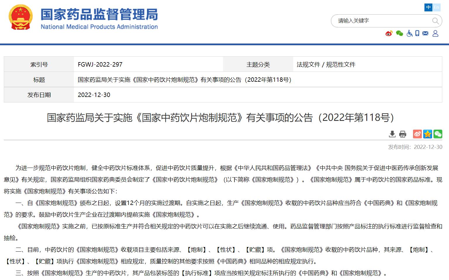 國(guó)家藥監(jiān)局關(guān)于實(shí)施《國(guó)家中藥飲片炮制規(guī)范》有關(guān)事項(xiàng)的公告(2022年第118號(hào))
