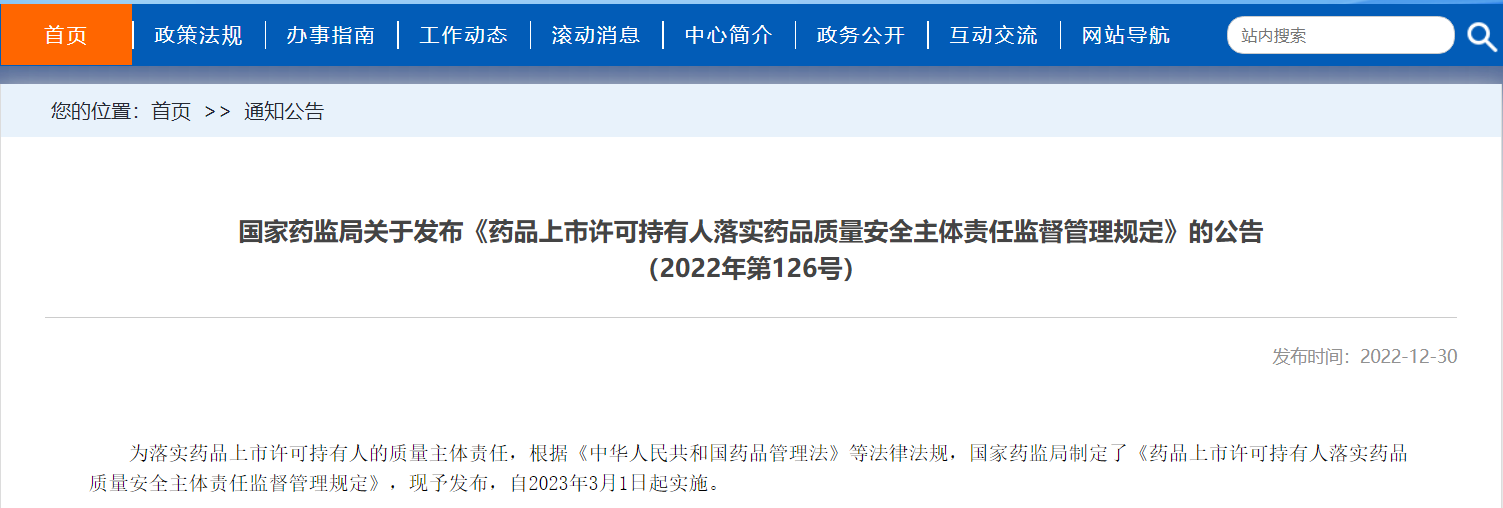 國(guó)家藥監(jiān)局關(guān)于發(fā)布《藥品上市許可持有人落實(shí)藥品質(zhì)量安全主體責(zé)任監(jiān)督管理規(guī)定》的公告(2022年第126號(hào))