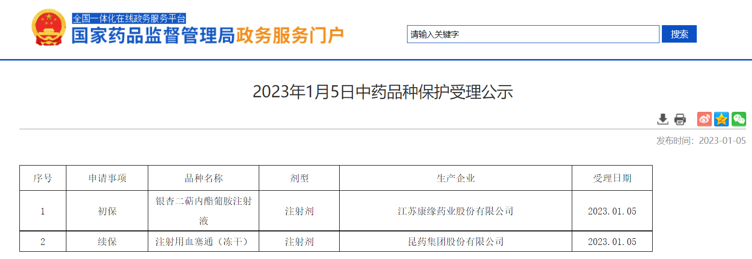 2023年1月5日中藥品種保護(hù)受理公示
