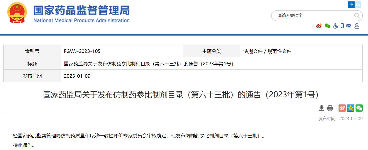 國(guó)家藥監(jiān)局關(guān)于發(fā)布仿制藥參比制劑目錄(第六十三批)的通告(2023年第1號(hào))