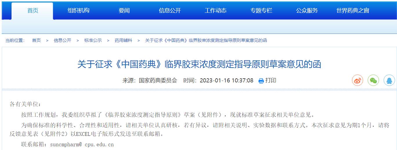 關(guān)于征求《中國(guó)藥典》臨界膠束濃度測(cè)定指導(dǎo)原則草案意見(jiàn)的函