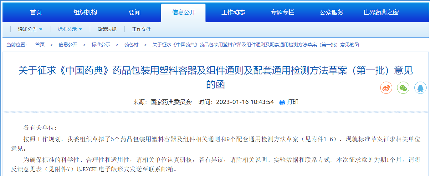 關(guān)于征求《中國(guó)藥典》藥品包裝用塑料容器及組件通則及配套通用檢測(cè)方法草案(第一批)意見(jiàn)的函