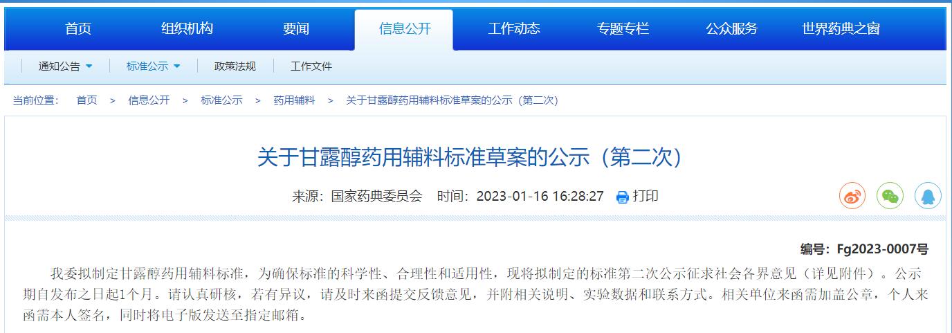 關(guān)于甘露醇藥用輔料標(biāo)準(zhǔn)草案的公示(第二次)